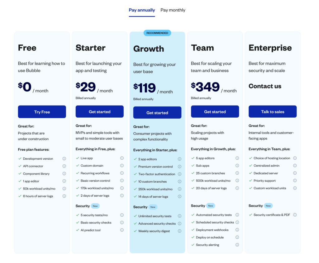 Bubbleには複数の有料プランがあり、それぞれ機能や料金が異なります。最適なプランを選ぶためには、以下のポイントを考慮しましょう。