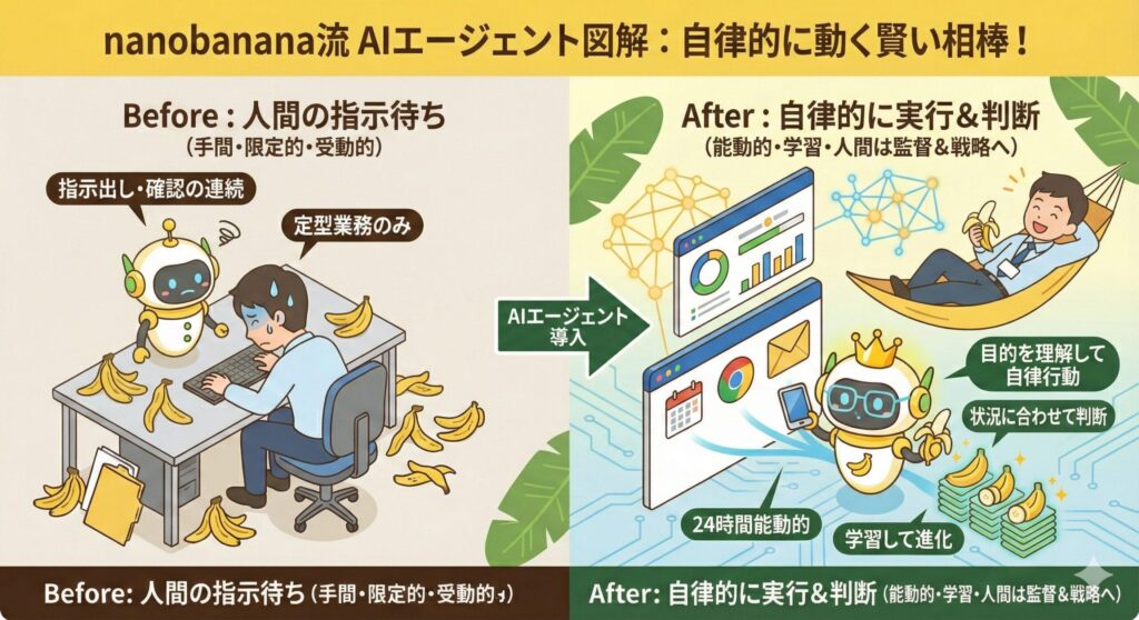 | 判断能力 | × なし (AならBをする、のみ) | ◎ あり (状況を見て最適解を選ぶ) |