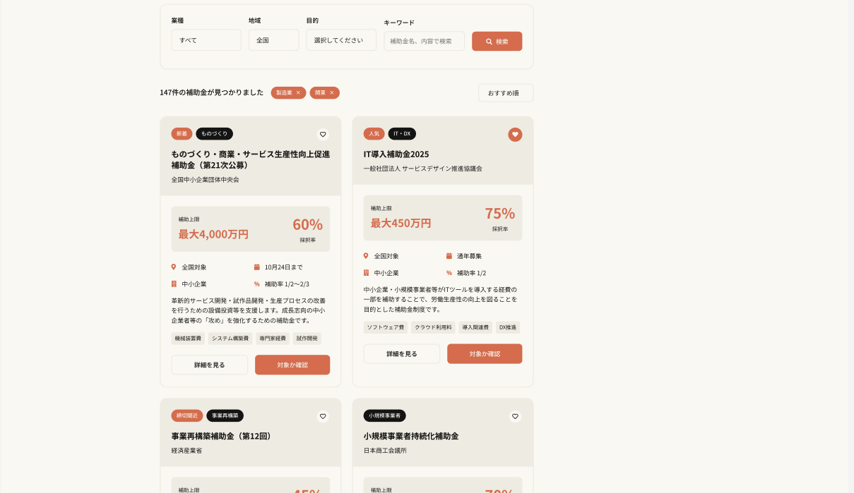 開発にあたり、同社は相談対応の実務に直結する機能を明確に定義しました。具体的には、補助金一覧と詳細情報の表示、簡易診断、お問い合わせの三つです。補助金情報は公的な情報源から取得し、一覧と詳細をサイト内で確認できる設計とすることで、相談時の情報提示を自社サイト内で完結させます。加えて簡易診断を用意することで、相談前の段階でも顧客が自分に合う制度を把握しやすくなり、問い合わせまでの導線が滑らかになります。