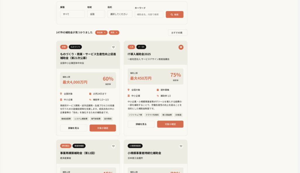 プロジェクト概要 JグランツAPIと連携し、補助金・助成金の一覧・詳細閲覧から簡易診断・問い合わせまでをワンストップで提供する自社ブランドのポータルサイトです。中小企業向けのDX支援・補助金申請支援を行うK社が、顧客への相談対応で自社ブランドの... -